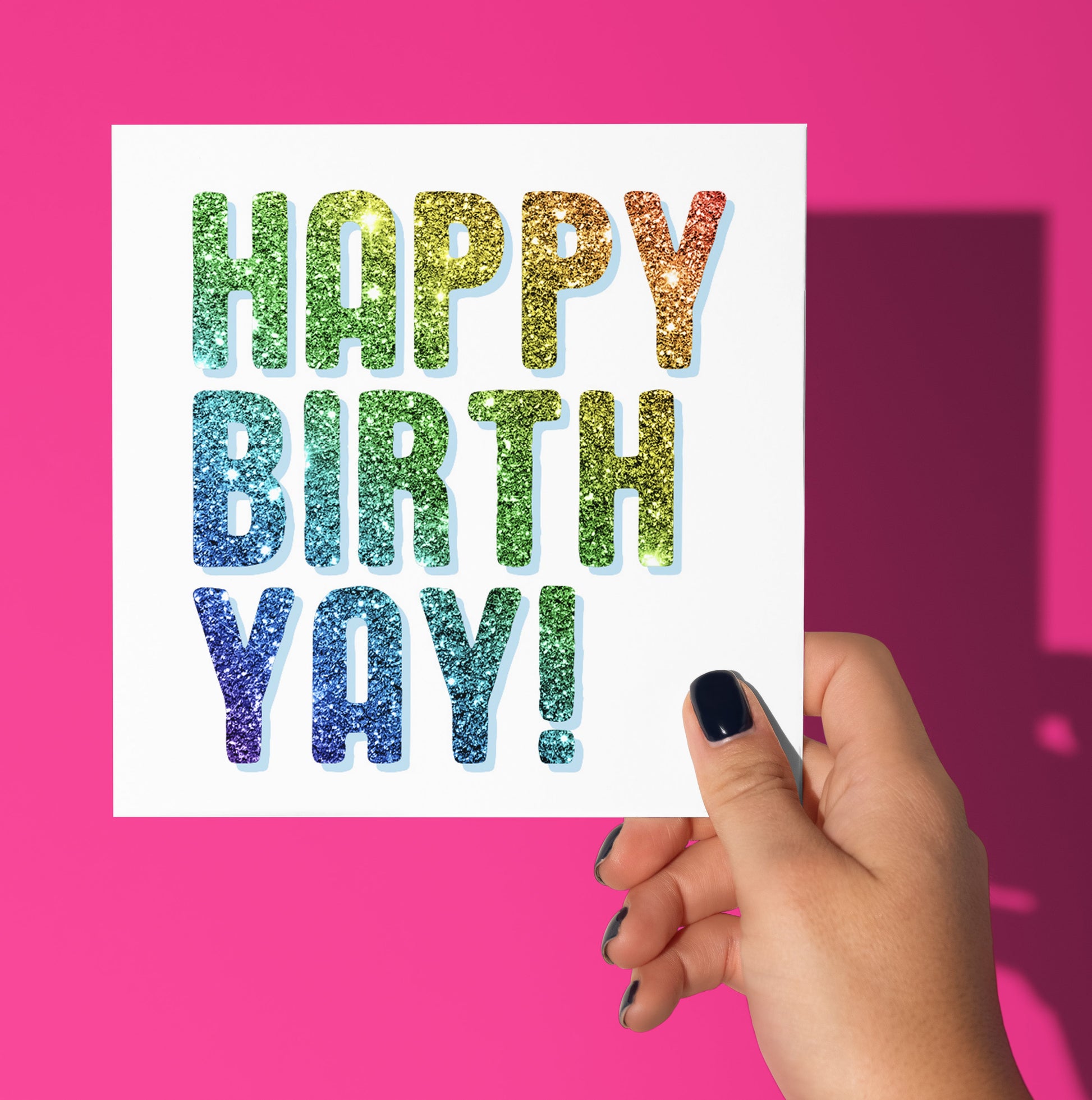 Happy Birth-Yay Birthday Card. Big and bold typographic rainbow birthday card, perfect for your wife or husband, your mum's birthday. Brilliant for your son, Dad, brother, best friend, queer pals or boyfriend celebrations on their special day!