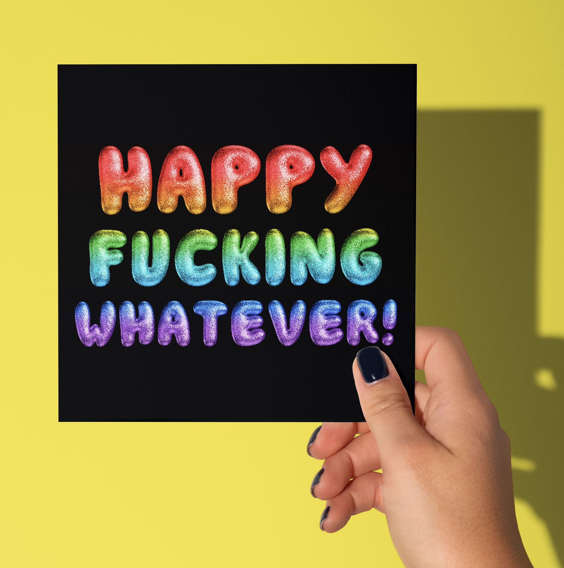Happy Fucking Whatever! Rainbow Font Card. Very sweary celebration card for any occasion.